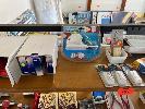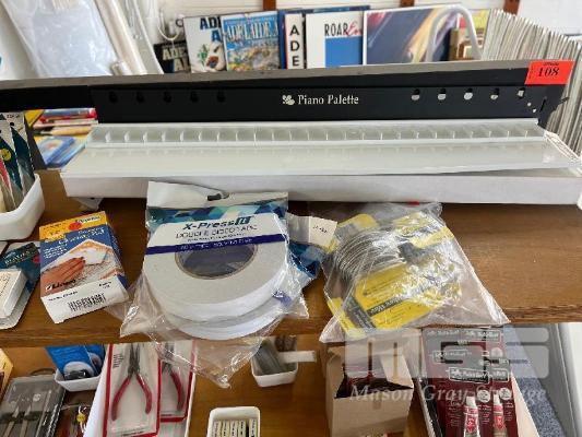 CONTENTS OF SHELF, SWISS ARMY KNIVES, LABELS, V GROOVE CUTTER, BLADES, DOUBLE SIDED TAPE ETC.