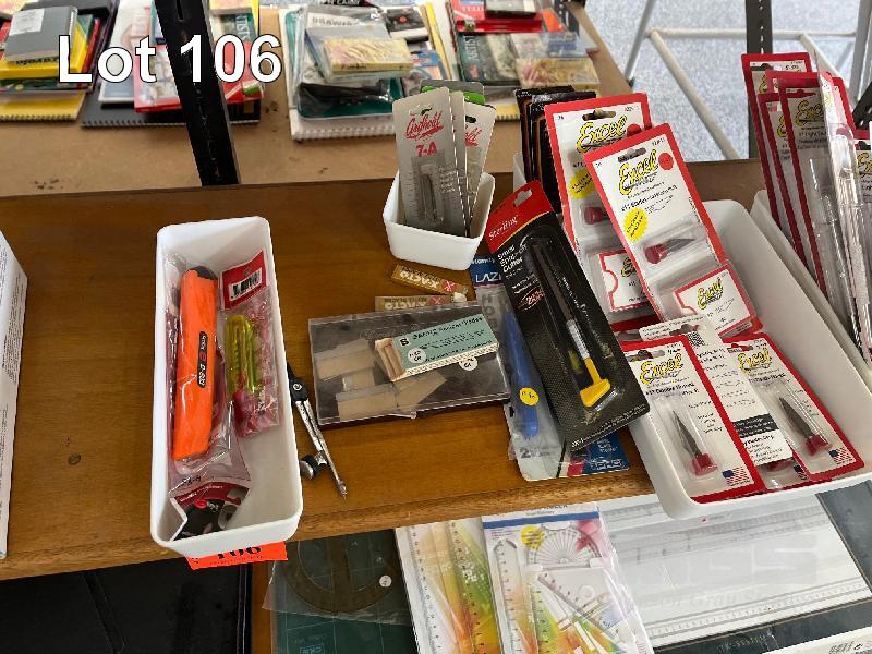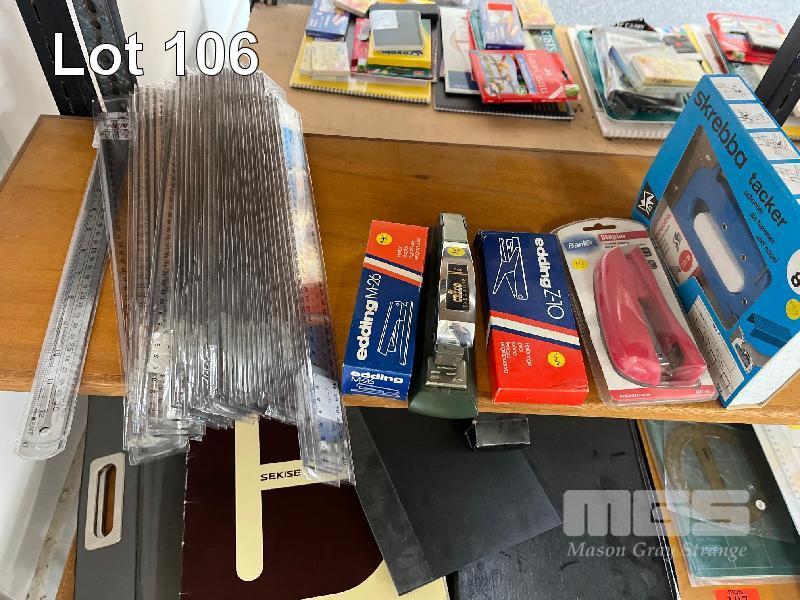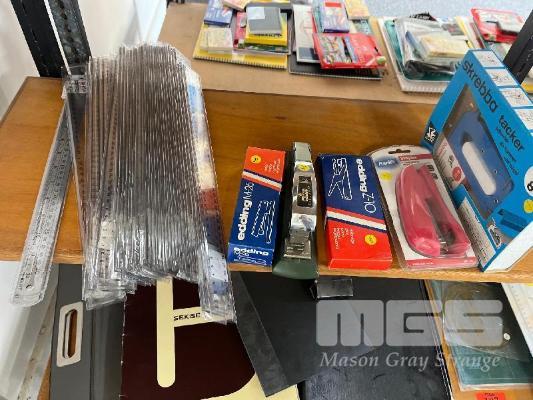 CONTENTS OF SHELF, RULERS, STAPLERS, UTILITY KNIVES, ETC.