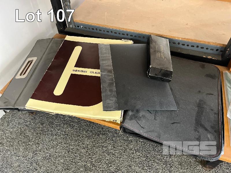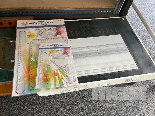 CONTENTS OF SHELF, DRAWING BOARD, RULER SETS, ASSORTED TRAVEL FOLDERS ETC.