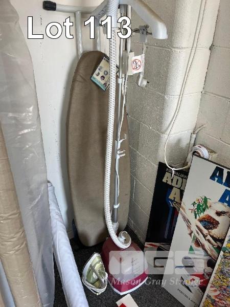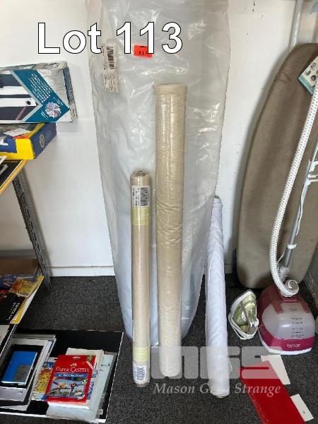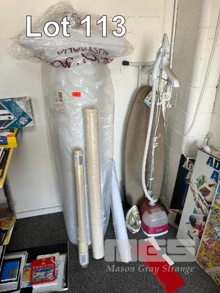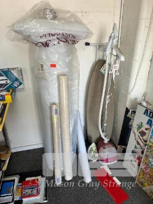 LARGE ROLL OF PELLON, ROLLS OF CALICO, IRON & IRONING BOARD, 240V 10 AMP PLUG