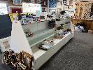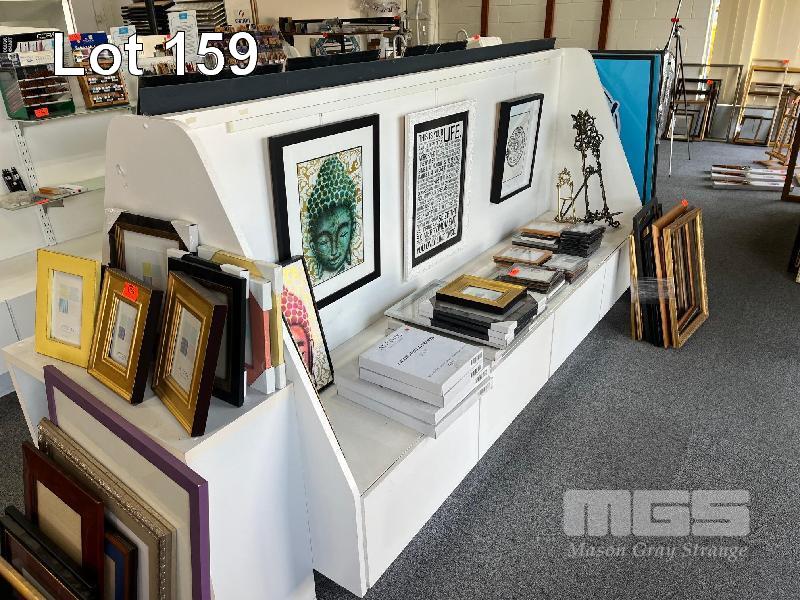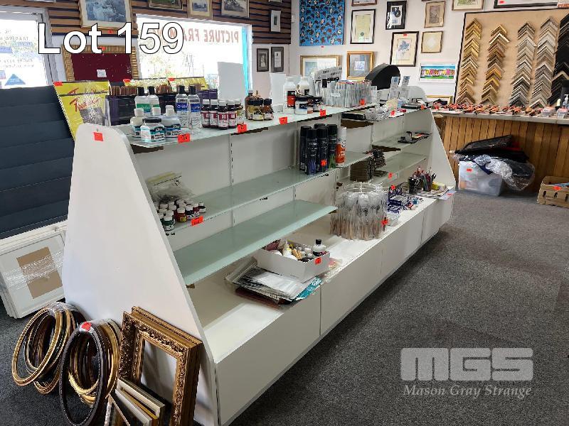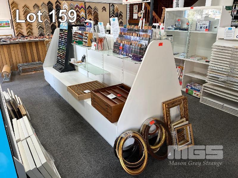 2 x WHITE TIMBER LAMINATE DISPLAY UNITS, GLASS SHELVES, 3200 x 1100 x 1340mm & 2500 x 1100 x 1340mm WITH DRAWERS