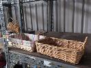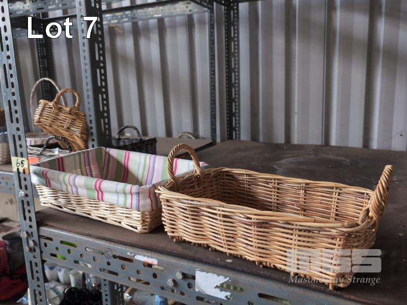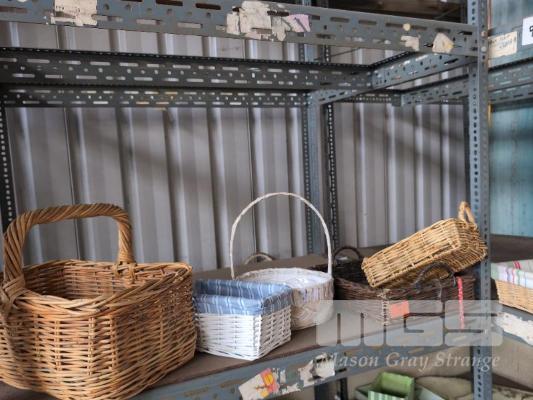 ASSORTED CANE BASKETS. 2 X SHELVES.