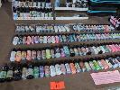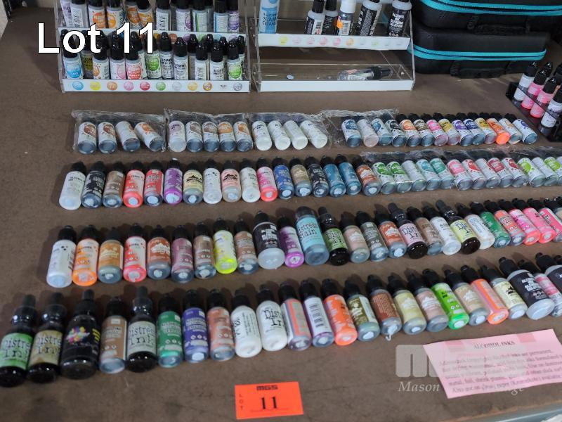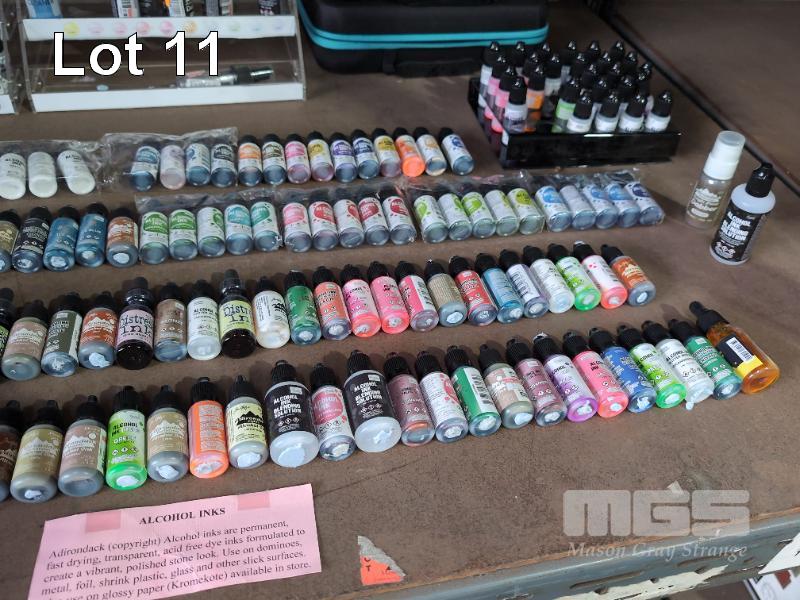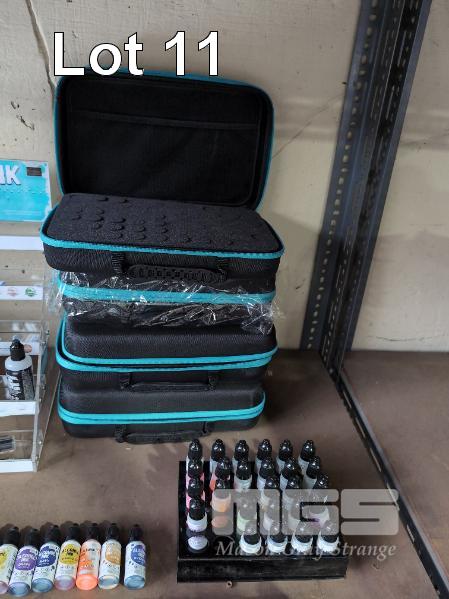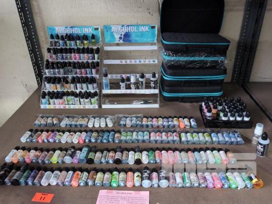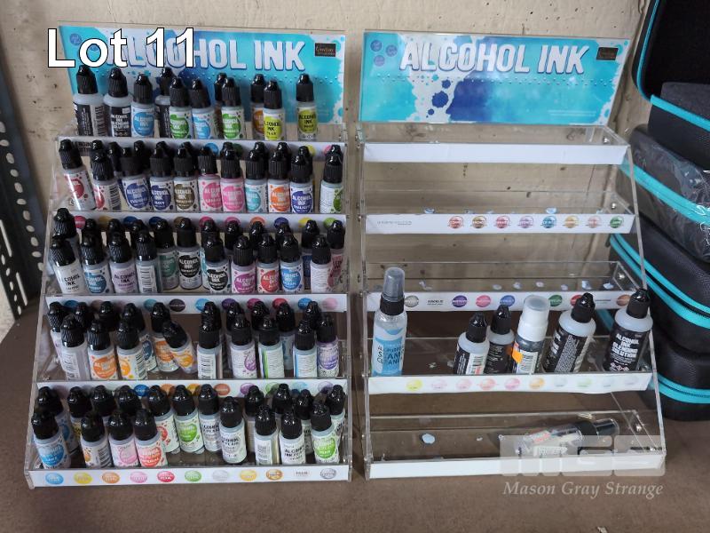 200 PLUS X ALCOHOL INK PAINTS. 2 X ALCOHOL INK PAINT DISPLAY STANDS. 4 X ALCOHOL INK CARRY CASES ETC. 1 X SHELF.