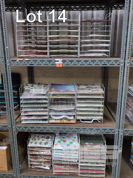 9 X CRAFT PAPER DISPLAY RACKS & CONTENTS. 3 X SHELVES.