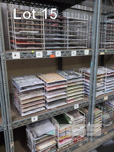 9 X CRAFT PAPER DISPLAY RACKS & CONTENTS. 3 X SHELVES.