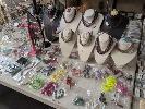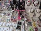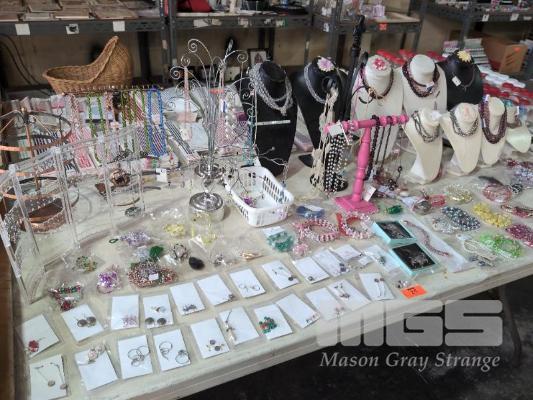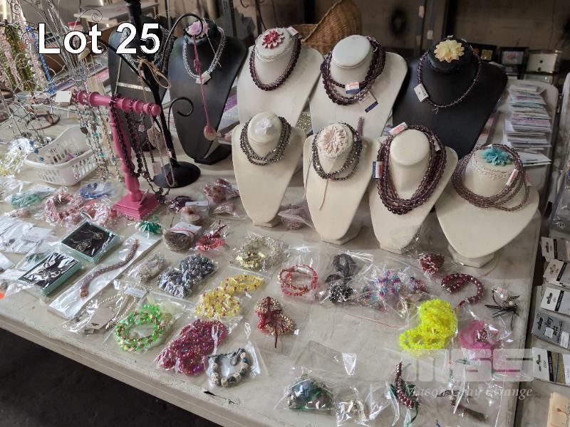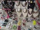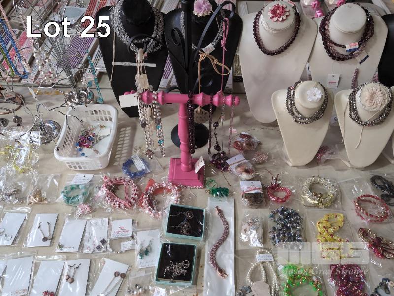 ASSORTED COSTUME JEWELLERY AND DISPLAY STANDS. 1 X TABLE.