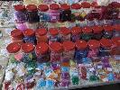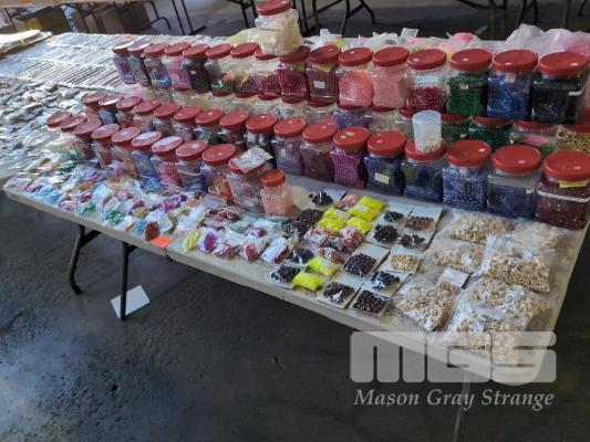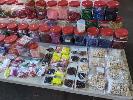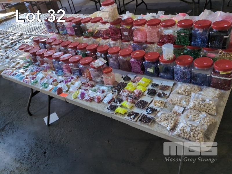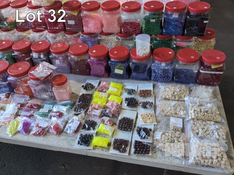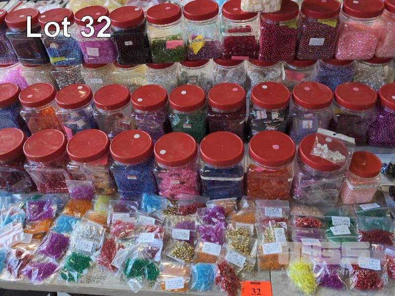 ASSORTED CRAFTING BEADS IN JARS AND RETAIL PACKS. 1 X TABLE.