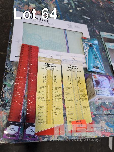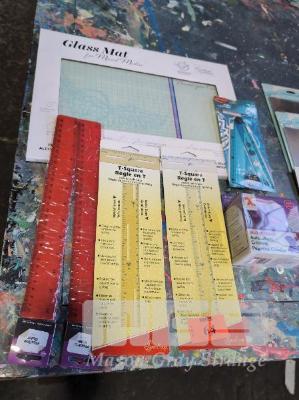 MIXED MEDIA GLASS MAT, XYRON STICKER MAKER & 6 X ASSORTED MEASURES.