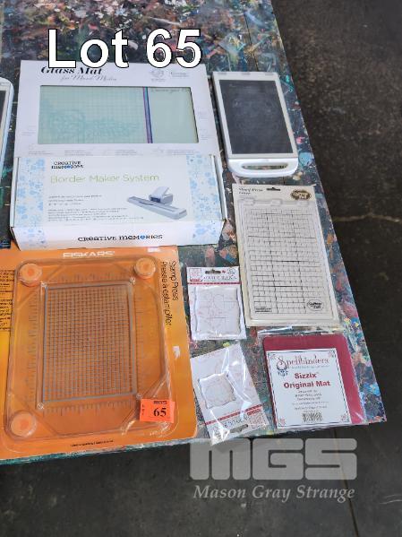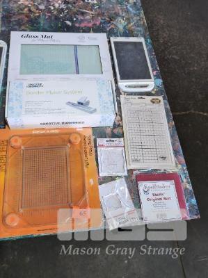 MIXED MEDIA GLASS MAT, BORDER MAKER SYSTEM, FISKARS STAMP PRESS, GOPRESS STAMP PRESS, GOPRESS STAMP PRESS COVER, 2 X ACRYLIC BLOCKS AND SIZZIX MAT.