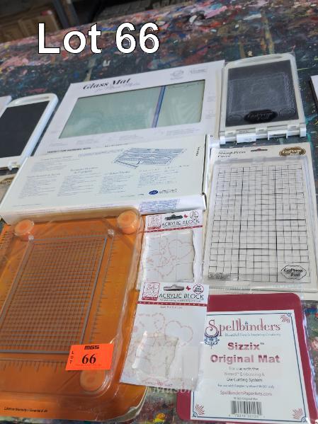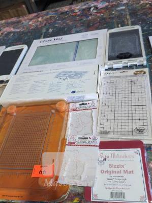 MIXED MEDIA GLASS MAT, DECORATIVE TRIMMER, FISKARS STAMP PRESS, GOPRESS STAMP PRESS, GOPRESS STAMP PRESS COVER, 2 X ACRYLIC BLOCKS AND SIZZIX MAT.