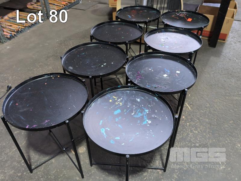 8 X PAINTERS STUDIO CONVENIENCE TABLES. BLACK METAL, CIRCULAR 440 MM DIAMETER, 530 MM HIGH.