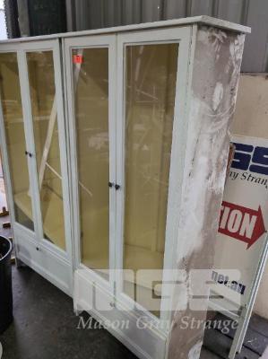 2 X LIME WASHED GLASS FRONTED, SINGLE DRAWER DISPLAY CABINETS.