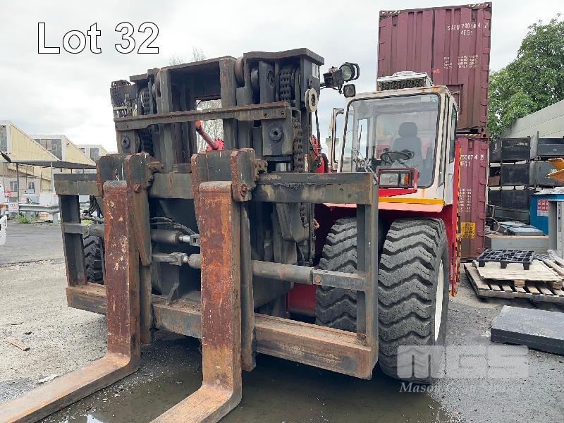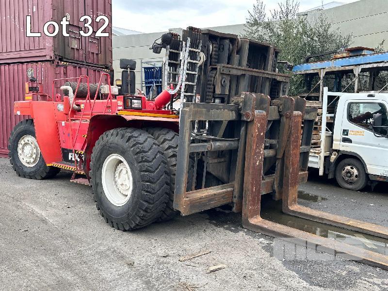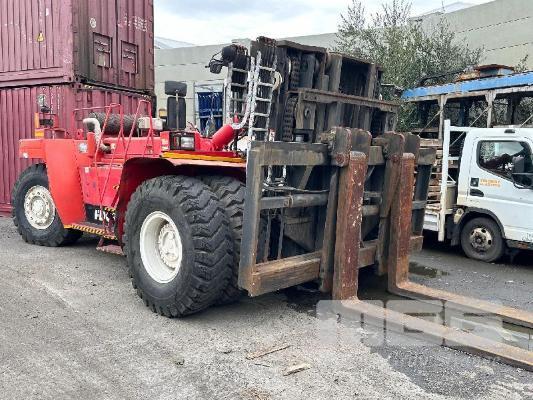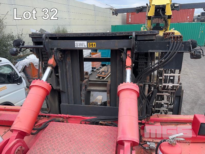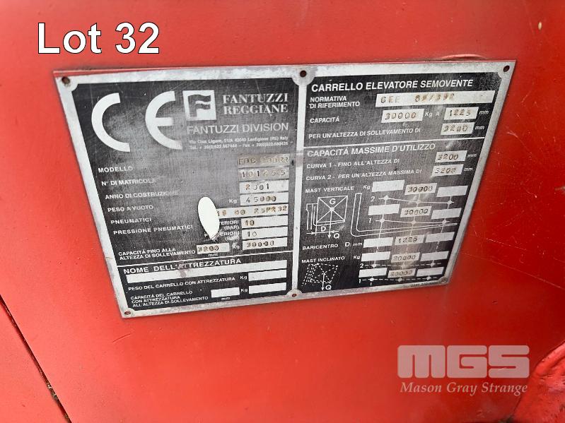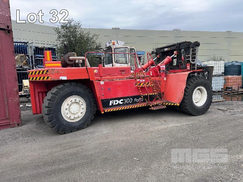 FANTUZZI (30 TON) LOW MAST CONTAINER LOADING FORK MODEL: FDC300RR DOM: 2001 CAPACITY: 30000kg @ 3200mm CENTER S/NO:101665 3 STAGE MAST, PNEUMATIC TYRES 2400mm BLADES VOLVO 6CYL TURBO DIESEL ENGINE