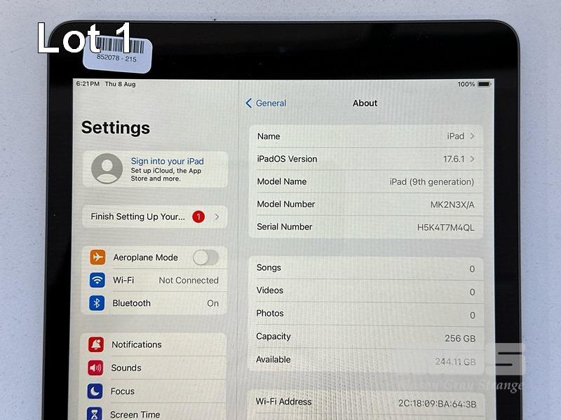 APPLE iPAD 9TH GEN, 256GB, Wi-Fi, SPACE GREY, MODEL MK2N3X/A, A2602 (NO CABLE, NO CHARGER) S/N:H5K4T7M4QL