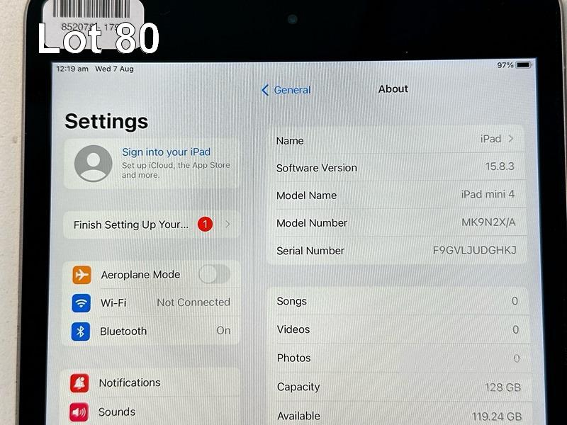 APPLE iPAD MINI 4TH GEN, 128GB, Wi-Fi, SPACE GREY, MODEL MK9N2X/A, A1538 WITH COVER (NO CABLE, NO CHARGER) S/N:F9GVLJUDGHKJ