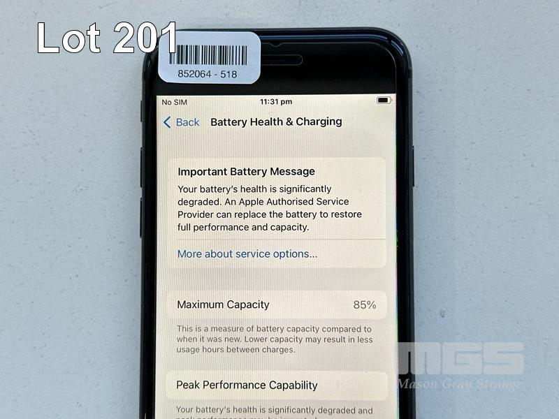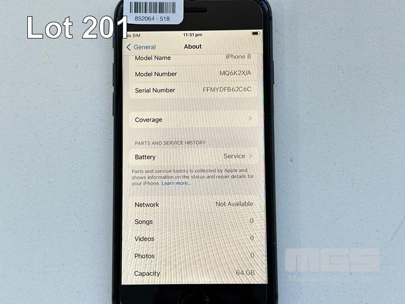 APPLE iPHONE 8, 64GB, SPACE GREY, MODEL MQ6K2X/A, BATTERY HEALTH 85% (NO CABLE, NO CHARGER) (NOTE: BATTERY SERVICE MESSAGE) S/N:FFMYDFB6JC6C