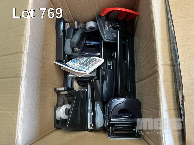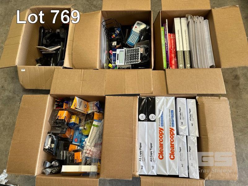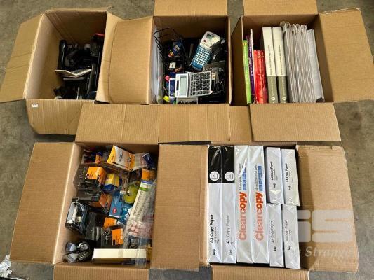 5 x BOXES ASST OFFICE STATIONERY, A4 & A3 PAPER REAMS, STAPLERS, HOLE PUNCHES, TAPE DISPENSERS ETC