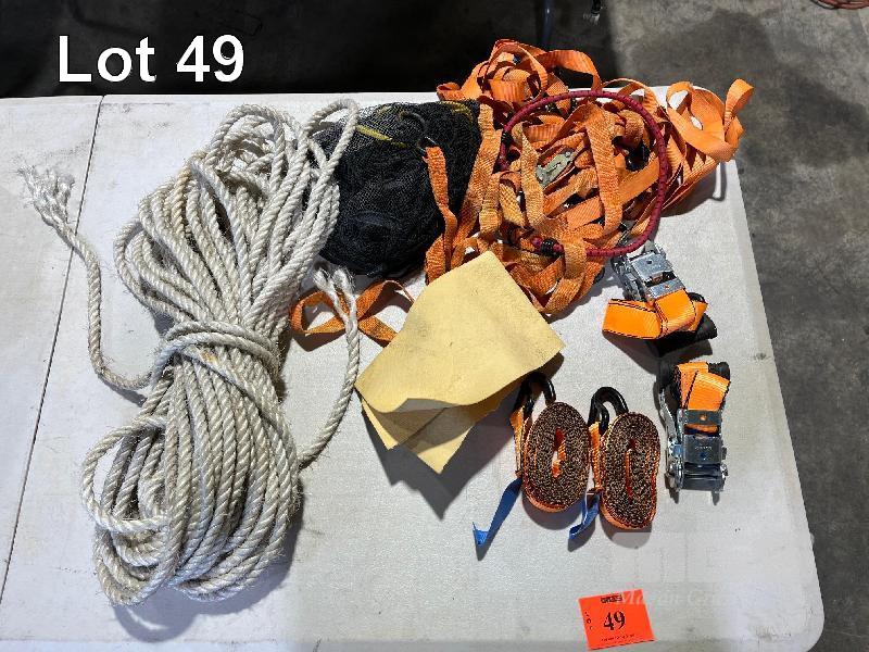 ASSORTED TIE DOWNS, CARGO NET & 30m WHITE NYLON ROPE, 12mm