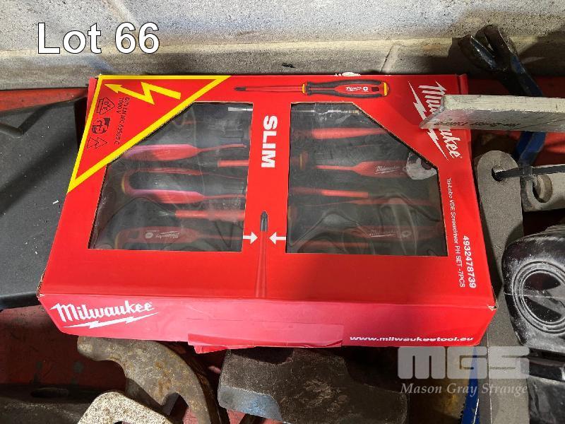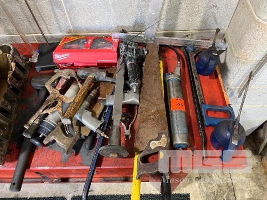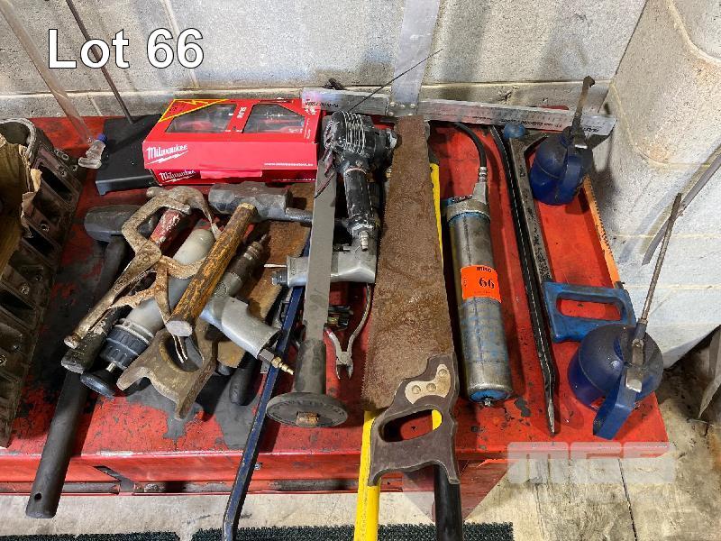3 x PNEUMATIC TOOLS, PINCH BAR, HAMMERS, HAND SAWS, VICE GRIPS, OIL CANS, GREASE GUN & NEW MILWAUKEE SCREWDRIVER SET