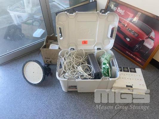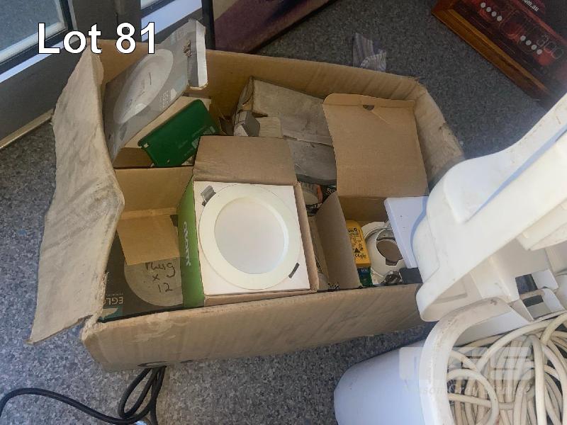 ASSORTED LIGHT & POWER FITTINGS, LED FLUSH MOUNT CEILING LIGHTS, 14 OUTLET POWER BOARD & TIMERS. & BALLASTS