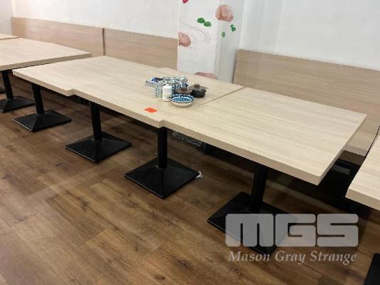 3 x CAFE TABLES, TIMBER LAMINATE, 800 x 900mm, BLACK PEDESTAL BASE WITH 2 x CAFE BENCH SEATS, TIMBER LAMINATE, 1200mm (L)