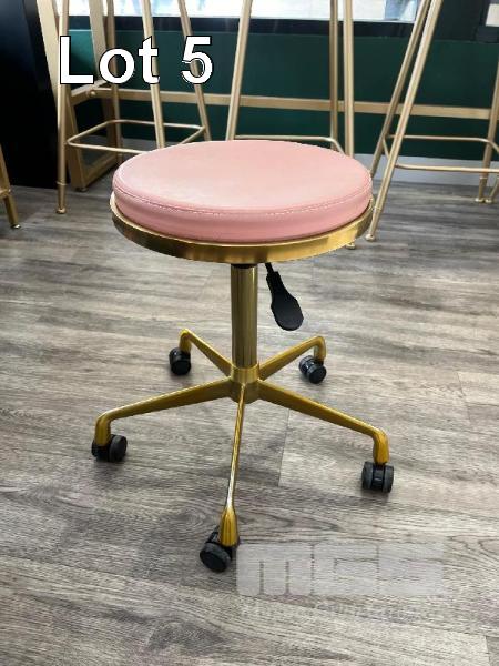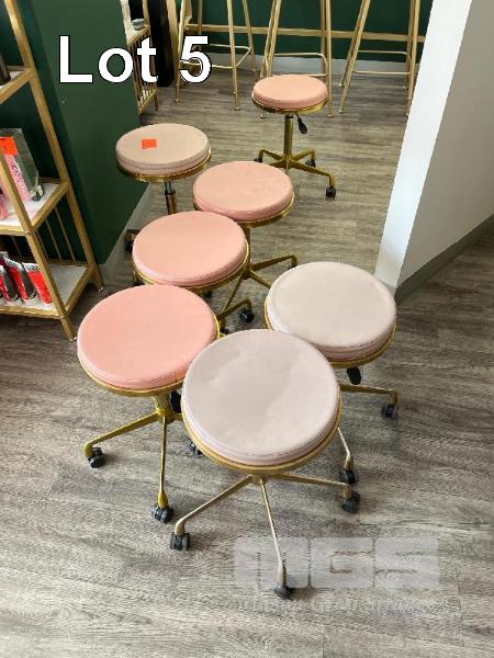 7 x SMALL GAS LIFT MOBILE STOOLS, GOLD STEEL FRAME, PINK VINYL TOP