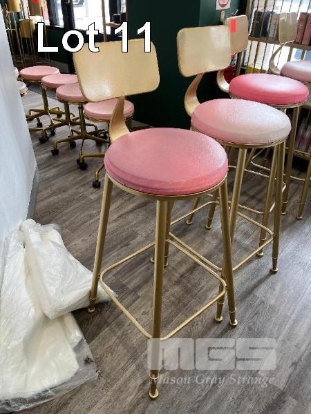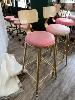 4 x BAR STOOLS, GOLD STEEL FRAME, PINK VINYL TOPS