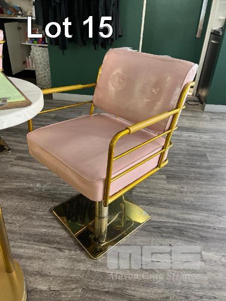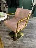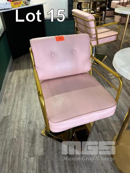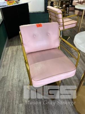 2 x GAS LIFT SALON CHAIRS, GOLD STEEL FRAME, PINK VINYL