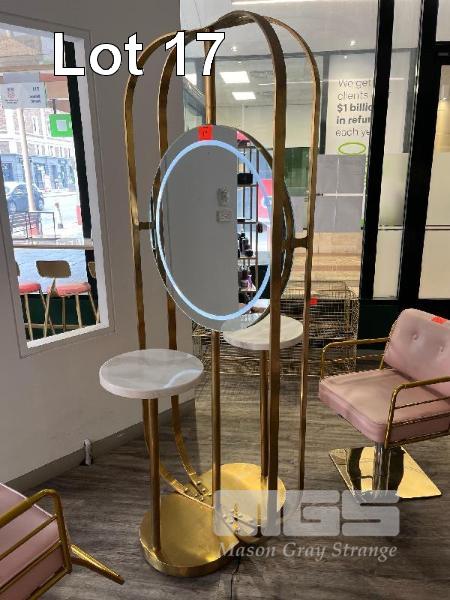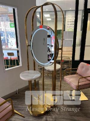 DOUBLE SIDED FREE STANDING SALON MIRROR, 2060 x 810mm FRAME, 780mm (D) ILLUMINATED MIRRORS, ARTIFICIAL STONE COUNTER TOP, 240V
