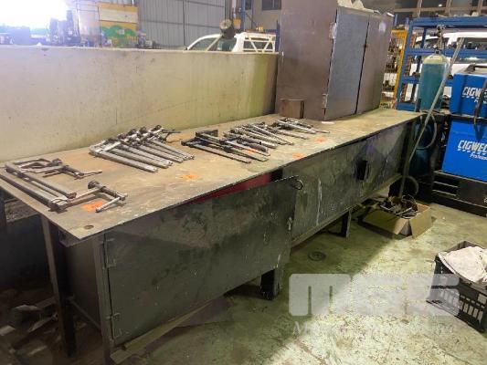 STEEL BENCH, 3320 x 920mm, PLATE TOP, 3 DOOR WITH 2 DOOR STOCK CUPBOARD