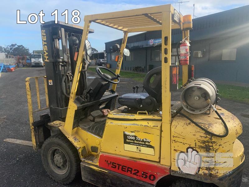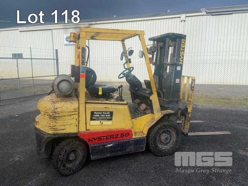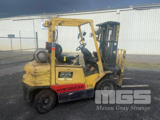 HYSTER 2.50 FORK LIFT MODEL: H2.50DX CAPACITY: 1930kg @ 600mm L/C HOURS: 10,080 APPROX. MAX HIGHT: 4590mm LPG, 3 STAGE CONTAINER MAST SIDE SHIFT, PNEUMATIC TYRES