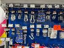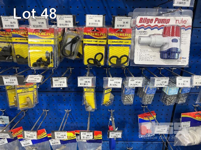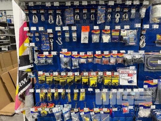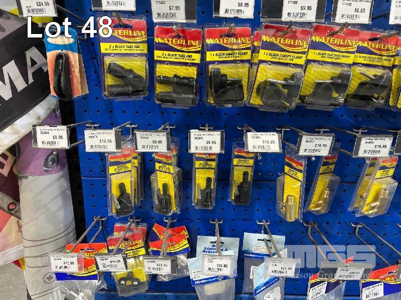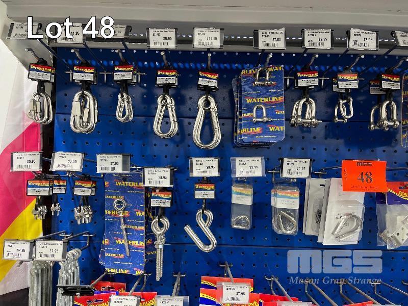 LARGE QTY WATERLINE MARINE ACCESSORIES, STAINLESS STEEL HOOKS, EYE BOLTS, THIMBLES, SWIVELS & SHACKLES PLUS WATER LINE BRASS HOSE FITTINGS, CLAMPS, BUNGEE STRAPS, STAINLESS STEEL SCREWS & POP RIVETS (CONTENTS 1 SHADOW BOARD)