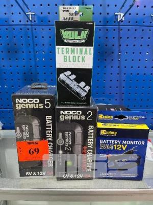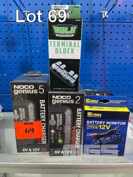 2 x NOCO GENIUS BATTERY CHARGERS MOD: GENIUS5AU & GENIUS2AU HULK TERMINAL BLOCK, CENTURY 12V BATTERY MONITOR, PROJECTA INVETER SWITCH