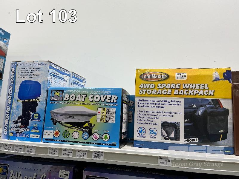 ASSORTED COVERS SUIT OUTBOARD MOTORS, SPARE WHEELS, STEERING WHEELS, BOAT COVERS & 4x4 STORAGE BACKPACK