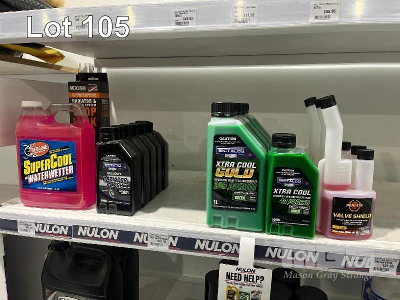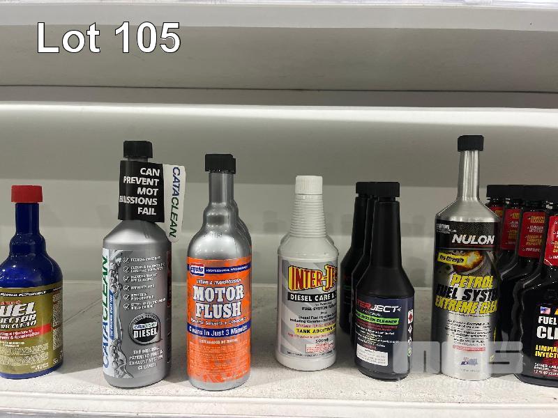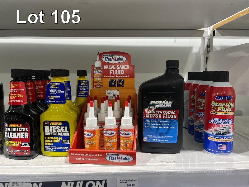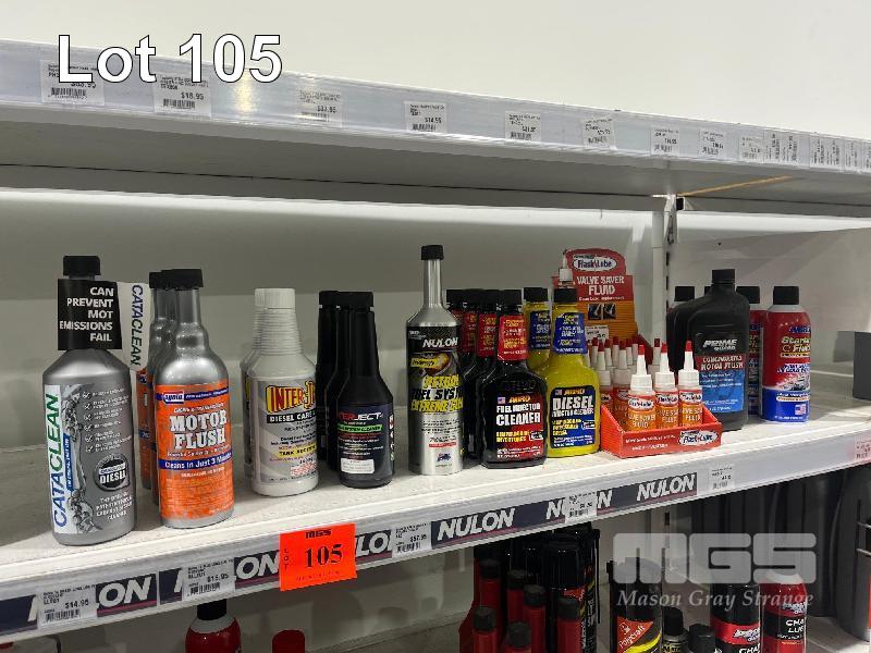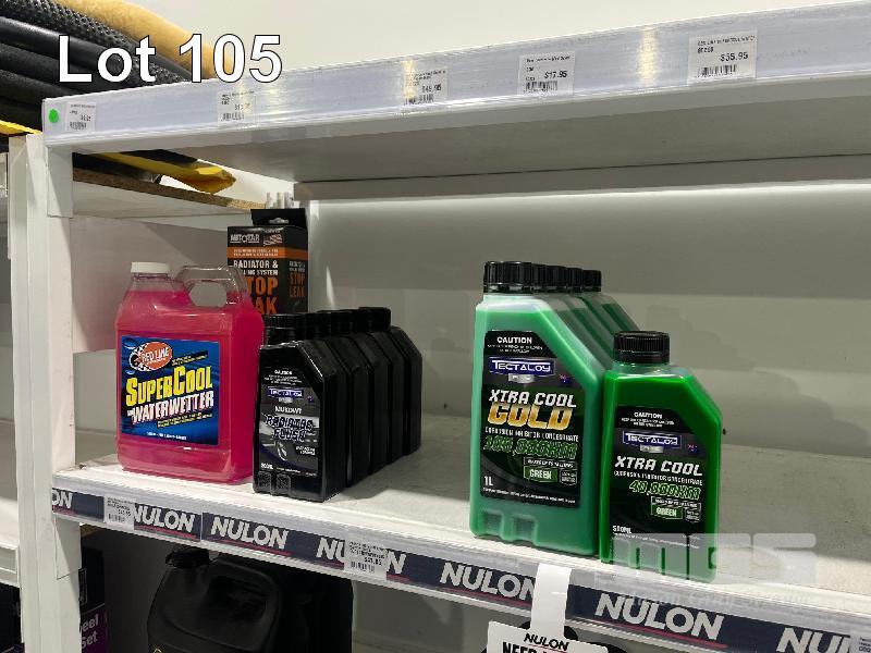 LARGE QTY AUTOMOTIVE FLUIDS, RADIATOR FLUSH, COOLANT, STOP LEAK, WATER WETTER, MOTOR FLUSH, INJECTOR CLEANER, FUEL CLEANER, STARTER FLUID ETC. (CONTENTS OF 1 SHELF)