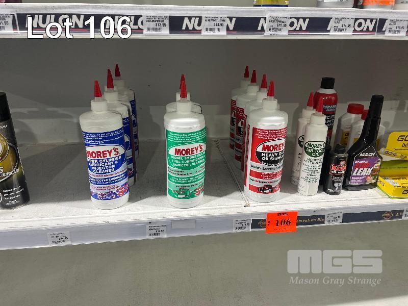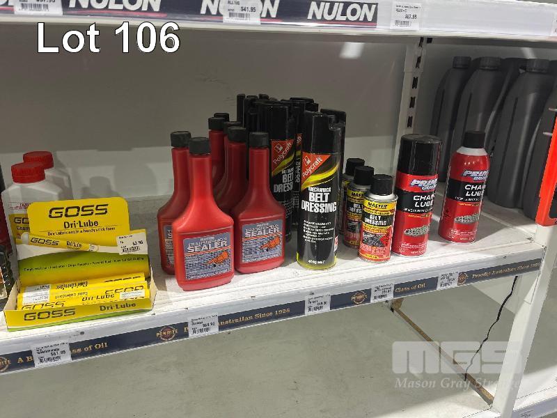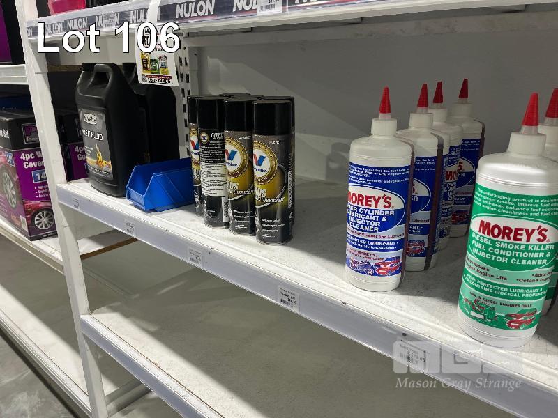 LARGE QTY AUTOMOTIVE FLUIDS, INJECTOR CLEANER, OIL STABILISER, AIR TOOL OIL, BELT DRESSING, CHAIN LUBE, STICK LUBE, STOP LEAK ETC. (CONTENTS OF 1 SHELF)