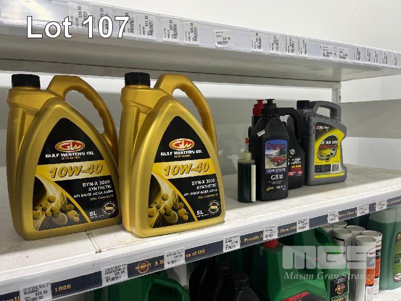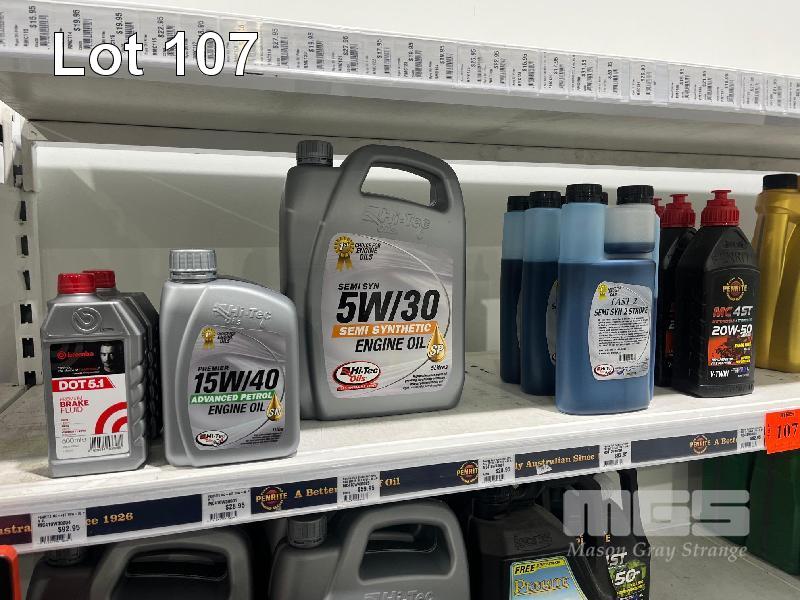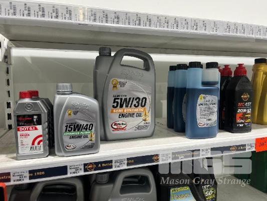 LARGE QTY AUTOMOTIVE FLUID, BRAKE FLUID, ENGINE OILS, 4 STROKE OIL, 2 STROKE OIL, GEARBOX OIL, DAMPER OIL ETC. (CONTENTS OF 1 SHELF)