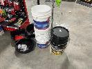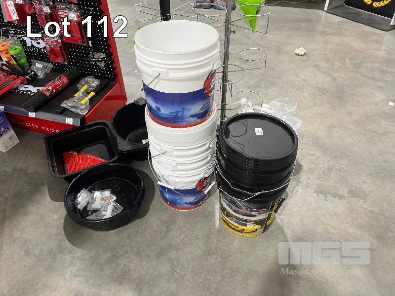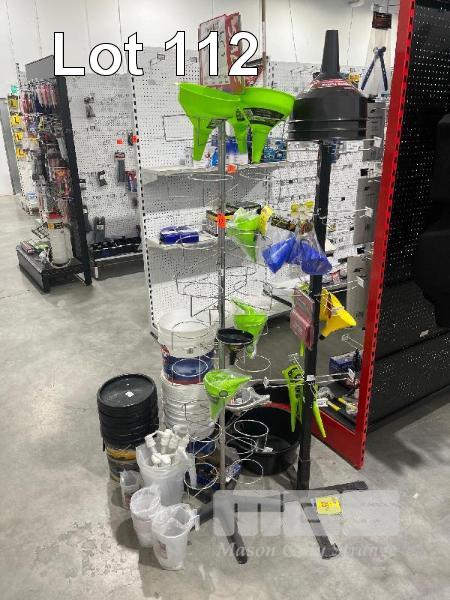 ASSORTED FUNNELS, BUCKETS, DRAIN PANS, FLUID PLUMS, 2 x VERTICAL PRODUCT STANDS