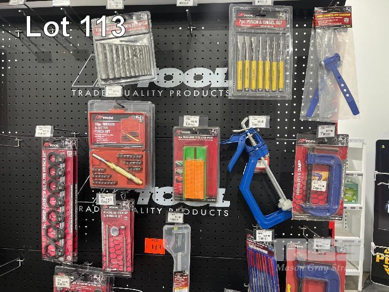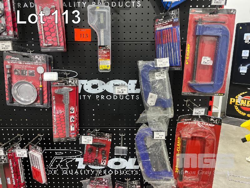 LARGE QTY AUTOMOTIVE TOOLS, PUNCH SETS, OIL FILTER WRENCH SETS, G CLAMPS, AIR STARTER KIT ETC. (CONTENTS OF 1 SHADOW BOARD)