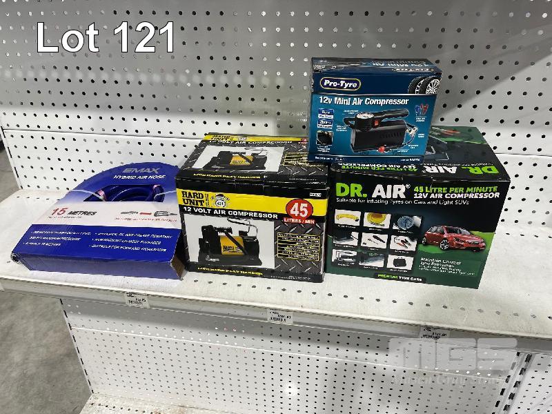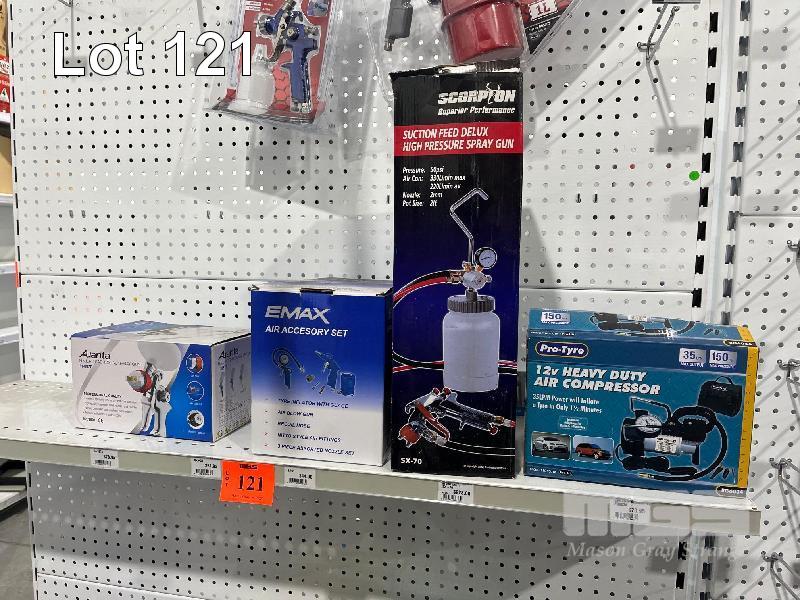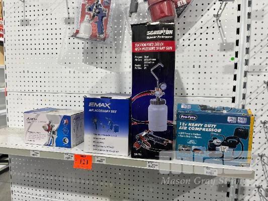 4 x 12V COMPRESSORS, SUCTION FEED DELUXE SPRAY GUN, AIR ACCESSORY SETS, SPRAY GUNS, DEGREASING WASHGUN, AIR HOSE ETC. (CONTENTS OF 1 SHADOW BOARD)