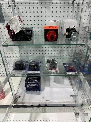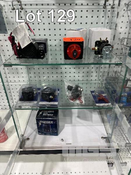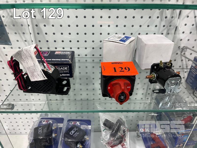LARGE RELAYS, BATTERY ISOLATOR, DUAL VOLT METER, REVERSING ALARMS ETC. (CONTENTS OF GLASS CABINET)
