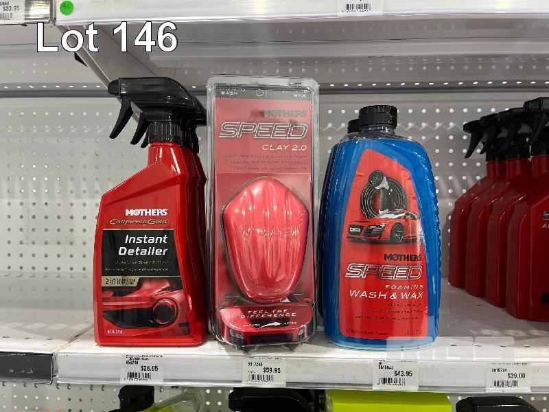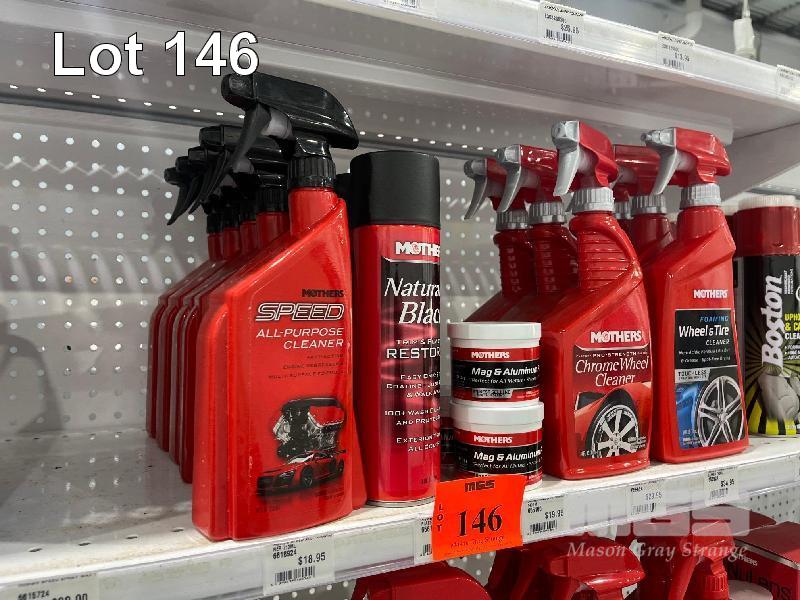 QTY MOTHERS CAR CLEANING PRODUCTS: WASH & WAX, INSTANT DETAILER, MAG WHEEL POLISH, WHEEL & TIRE CLEANER, UPOLSTERY CLEANER, NATURALLY BLACK, (CONTENTS OF 1 SHELF)