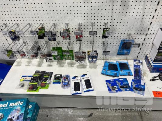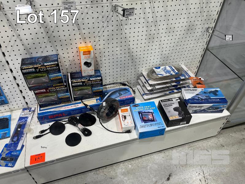 3 x 5" LCD MONITORS, SPEAKER CABLE, CENTRAL LOCKING SYSTEM, ASSORTED BATTERIES, WIRELESS CHARGING PADS, NOISE SUPPRESSOR ETC. (CONTENTS OF 1 SHELF)