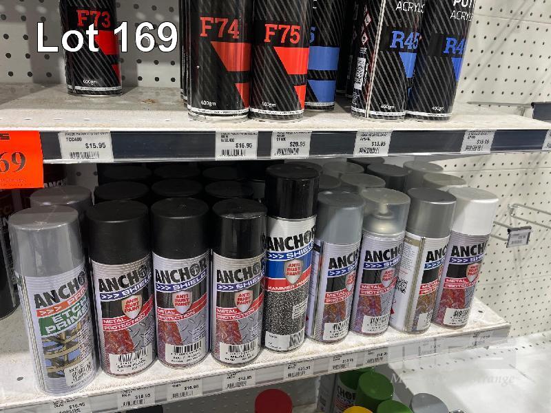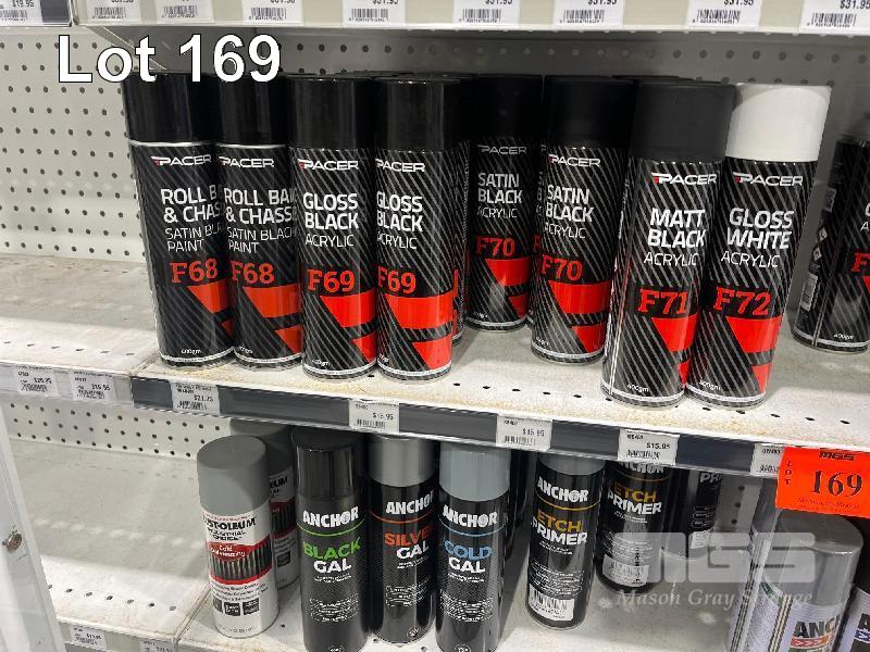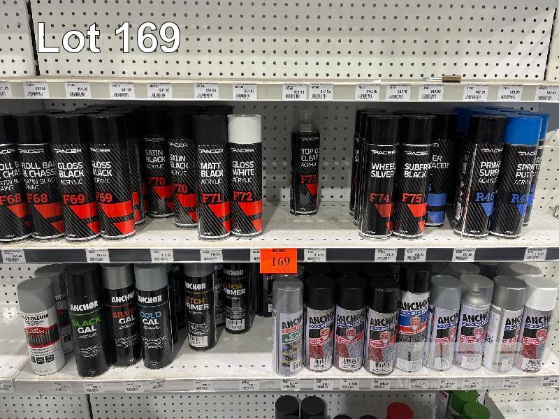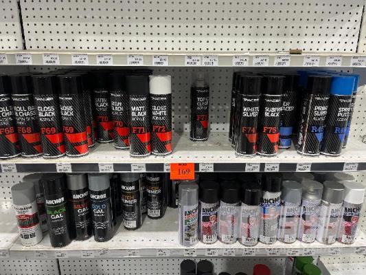 ASSORTED AUTOMOTIVE AEROSOLS, ACRYLIC, ROLL BAR & CHASSIS, ETCH PRIMER, GALV PAINT, ANTI RUST, ETC. (CONTENTS OF 2 SHELVES)