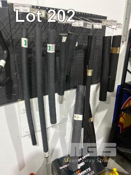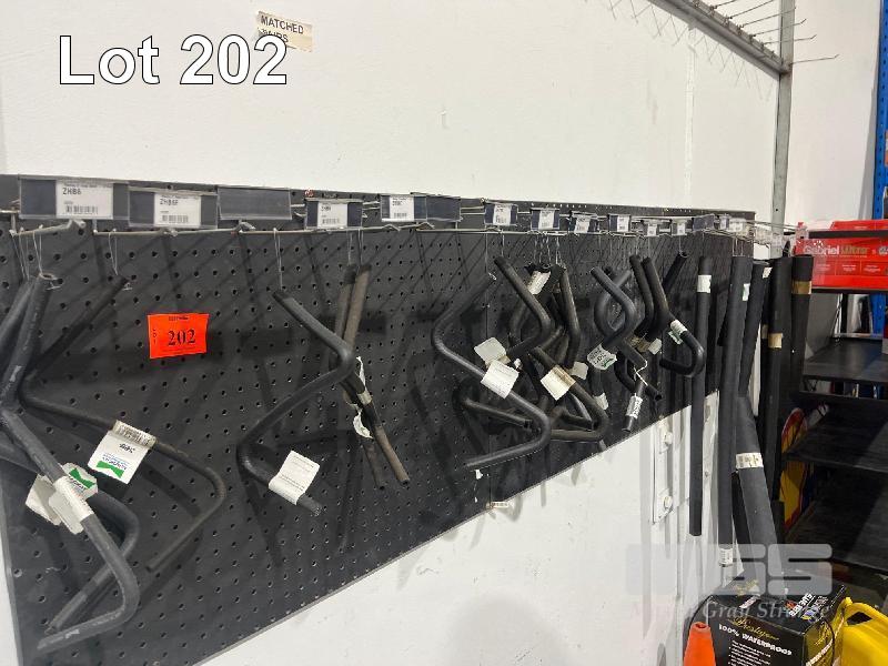 LARGE QTY ASSORTED HOSES, WATER & FUEL FROM 6mm TO 63mm, WALL MOUNT SHADOW BOARD INCLUDED, 2300 x 600mm