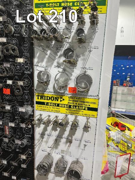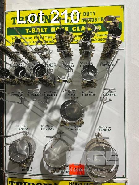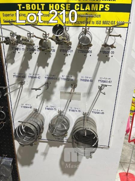 LARGE QTY ASSORTED TRIDON T-BOLT HOSE CLAMPS, 17mm TO 121mm