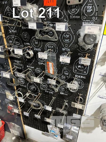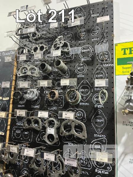 LARGE QTY EXHAUST MANIFOLD GASKETS & FLANGES, WALLMOUNT STORAGE INCLUDED
