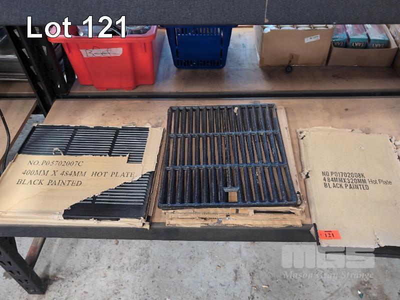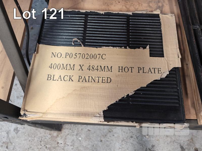 10 X BBQ HOT PLATES & GRILLS BLACK PAINTED. 3 @ HOT PLATES. 400 X 484 MM. 6 @ GRILLS. 455 X 396 MM. 1 @ HOT PLATE. 484 X 320 MM.
