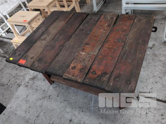 BESPOKE RUSTIC SOLID TIMBER ANTIQUE "CONVEYOR BELT" COFFEE TABLE. 1,010 X 760 MM.
