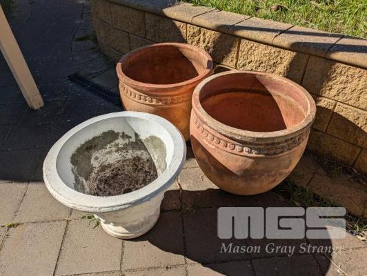PAIR OF LARGE TERRACOTTA POTS & WHITE PAINTED CONCRETE POT